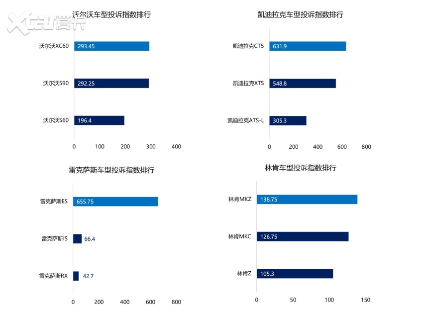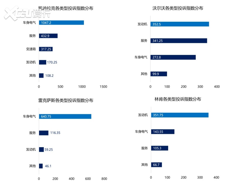 综合投诉数据来看,凯迪拉克投诉基数较高,沃尔沃投诉基数偏小但增速显著,雷克萨斯和林肯投诉指数涨幅整体处于可控区间。