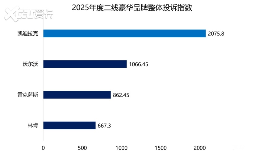 汽车门网数据显示:2025年凯迪拉克投诉指数达到了2075.8,同比增长了46%。紧随其后的是沃尔沃,投诉指数达到了1066.45,同比大涨了119%。雷克萨斯和林肯的投诉指数涨幅均不超25%。