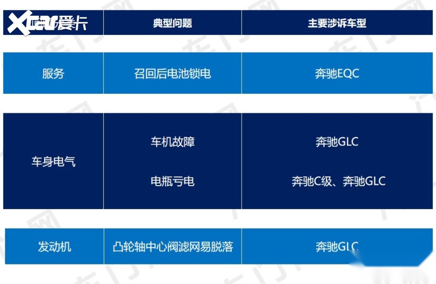 具体到主要涉诉车型,奔驰GLC的问题较多,投诉集中度相对较高,典型问题在于电瓶亏电、凸轮轴中心阀滤网易脱落。奔驰C同样也存在电瓶亏电的问题。奔驰EQC因为召回升级后电池锁电,更是重点吐槽对象。